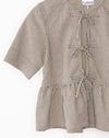 A cutie seersucker blouse by GANNI. A great khaki and dark grey seersucker make for a neutral stripe to wear with many thing. A cute skirted blouse with 3 tie closure in the front.